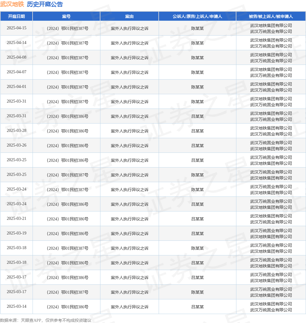案号:(2024)鄂01民初386号审理法院:湖北省武汉市中级人民法院案由:案外人执行异议之诉当事人信息: 原告/上诉人:吕某某 被告/被上诉人:武汉万统置业有限公司、武汉地铁集团有限公司开庭日期:2025年2月19日根据统计,近一年内以武汉地铁集团有限公司为当事人的历史开庭公告有150则,其中案由为“案外人执行异议之诉”的公告以109则居首,其次为“建设工程施工合同纠纷”有8则,“违反安全保障义务责任纠纷”有6则。历史开庭公告(前20条)如下: